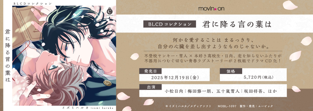 BLCDコレクション「君に降る言の葉は」音声CM 過去のTopics 2025年10月8日発売のBLCDコレクション「ピンクハートジャム beat 1」インタビュー到着! 「誰か夢だと言ってくれ」CD発売&OS開催 2024年9月27日発売のBLCDコレクション「ピンクハートジャム」インタビュー到着! 2024年7月26日発売のBLCDコレクション「宵闇シュガーキャット」インタビュー到着! 2023年11月24日発売のBLCDコレクション「友達はキスしない!」インタビュー到着! 2023年10月27日発売のBLCDコレクション「スウィートルームエスケイプ」インタビュー到着! 2023年9月29日発売のBLCDコレクション「Sub様、躾の時間です 1」インタビュー到着! BLCDコレクション10周年企画第一弾 旧譜販促キャンペーン 全タイトル 今後のリリース予定 2026年春頃予定 BD 【BD】AVAM 2nd Anniversary ONEMAN LIVE 『Devil Up!』 2026/03/27 BD 【BD】悪食令嬢と狂血公爵 下巻 2026/03/25 DVD ブルーロック VS. U-20 JAPAN 1 2026/03/25 DVD ブルーロック VS. U-20 JAPAN 3 2026/03/25 DVD ブルーロック VS. U-20 JAPAN 2 2026/03/25 DVD ブルーロック VS. U-20 JAPAN 4 2026/03/25 グッズ ブルーロック VS. U-20 JAPAN 全巻予約有償特典 アクリルスタンド1種:糸師 凛、糸師 冴 2026/02/27 BD 【BD】悪食令嬢と狂血公爵 上巻 2026/02/13 CD BLCDコレクション「息できないのは君のせい5」 2026/02/06 BD ドラマ『gift』 Blu-ray CD DJCD ハイキュー!! 烏野高校放送部! 第19巻 2026/01/30 アニメ「ハイキュー!!」と一緒に楽しむWEBラジオ、「ハイキュー!! 烏野高校放送部!」のDJCD第19弾。 新規録り下ろし音源には田中龍之介役の林勇がゲストで登場!!ファーストシーズンから劇場版「ハイキュー!!ゴミ捨て場の決戦」までを振り返りつつ、キャラクターや思い出のシーンについて語っていただきました!最終回を収録した「ハイキュー!!」ファン必聴の内容でお届けします!! @movic_media からのツイート 過去のNews 09/22 NEWS 10月8日発売のBLCDコレクションBLCDコレクション「ピンクハートジャム beat 1」インタビュー到着! 10/03 NEWS BLCDコレクション「ピンクハートジャム」アニメイト限定セット(アニメイト有償特典セット)特典CDのお詫びと交換のお知らせ 08/02 NEWS 「ピンクハートジャム」アニメイト限定セットについてのお知らせ 04/28 NEWS 『オトメイトパーティー2022』Blu-ray アニメイト・Amazon特典に関するお詫びとお知らせ 08/23 NEWS BLCDコレクション「僕の番はサラブレットΩ」 商品交換のお詫びとお知らせ 07/22 NEWS BLCDコレクション「SとN」バックジャケット誤植のお詫び 過去の番組 現在放送・配信中の番組はありません。