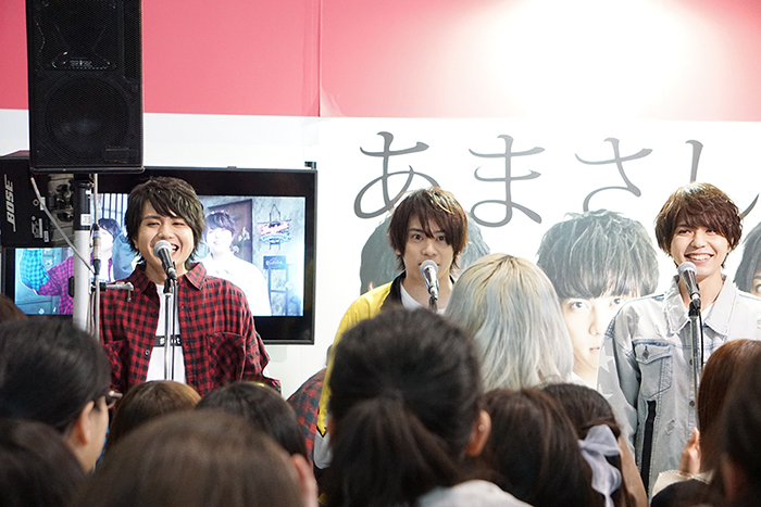 今回、アニメイトブースで先行発売された1stシングル「君にだけのLOVE SONG」。3人はCDデビューが決定したときの驚き、レコーディングやMV撮影の感想などを披露。何から何まで驚きつつも楽しかった様子が伝わって来ました。
