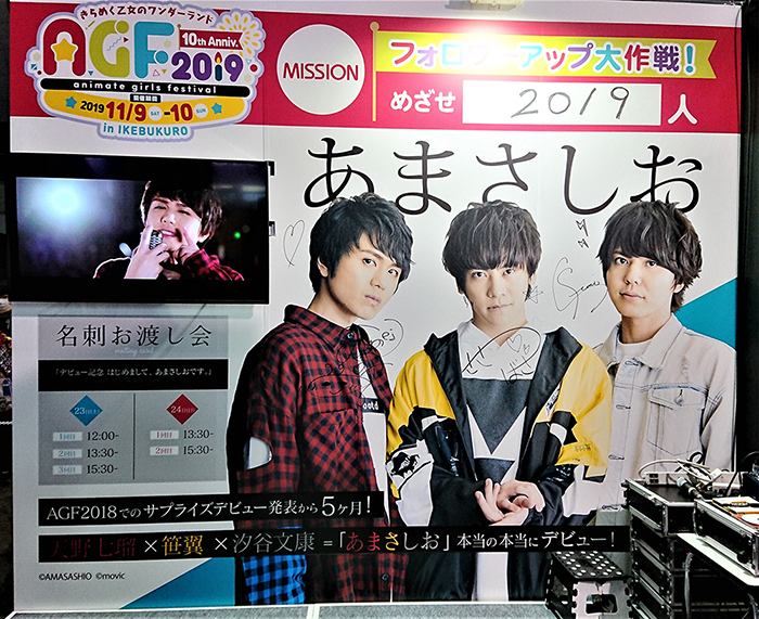 『あまさしお』は2018年のアニメイトガールズフェスティバル2018(AGF2018)でオフィシャルサポーターユニットとして結成された、声優の天野七瑠さん、笹翼さん、汐谷文康さんのユニット。ユニット名は3人の苗字の頭文字を取ったものとなっています。