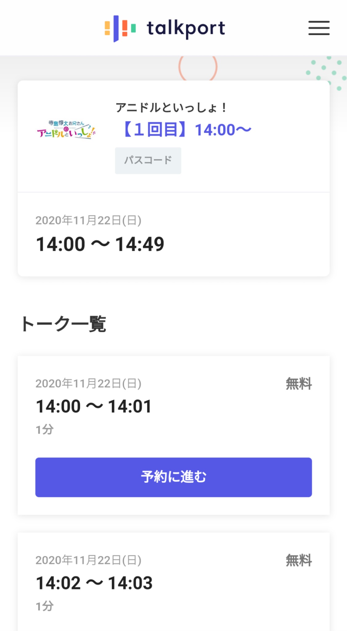 お好きな時間のトーク枠を選択します(先着順となります)。