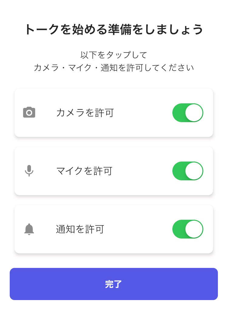 カメラ・マイク・通知をタップし許可します。